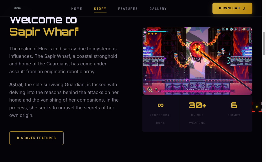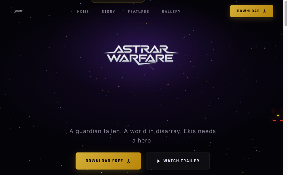 The website is convincingly designed, featuring game trailers, a fictional storyline about a guardian named "Ekis," and multiple download buttons. However, the downloaded Astral_Warfare.rar file contains nothing but malware.