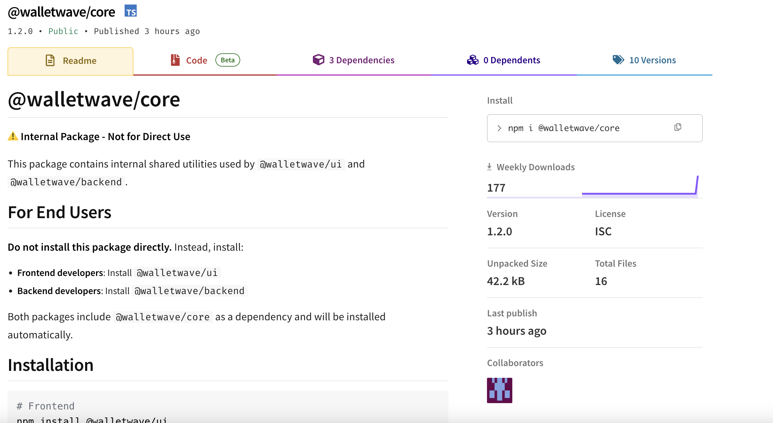 While the first two seem like legitimate crypto packages for walletwave that use solana, they have a dependency package ‘@walletwave/core’: