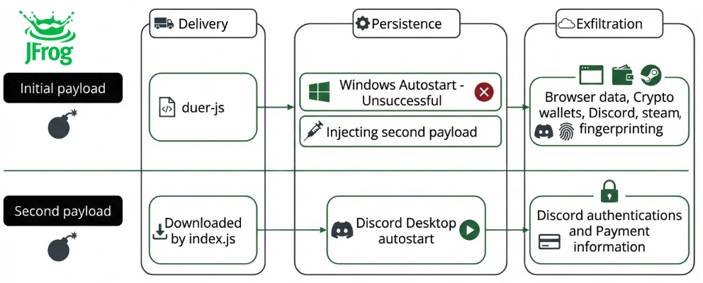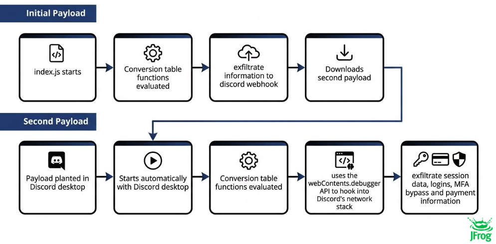 In addition to stealing information from the host it infected, the malicious package downloads a secondary payload. This payload is designed to run on Discord Desktop app startup, with self updating capabilities, stealing directly from it, including payment methods used by the user.