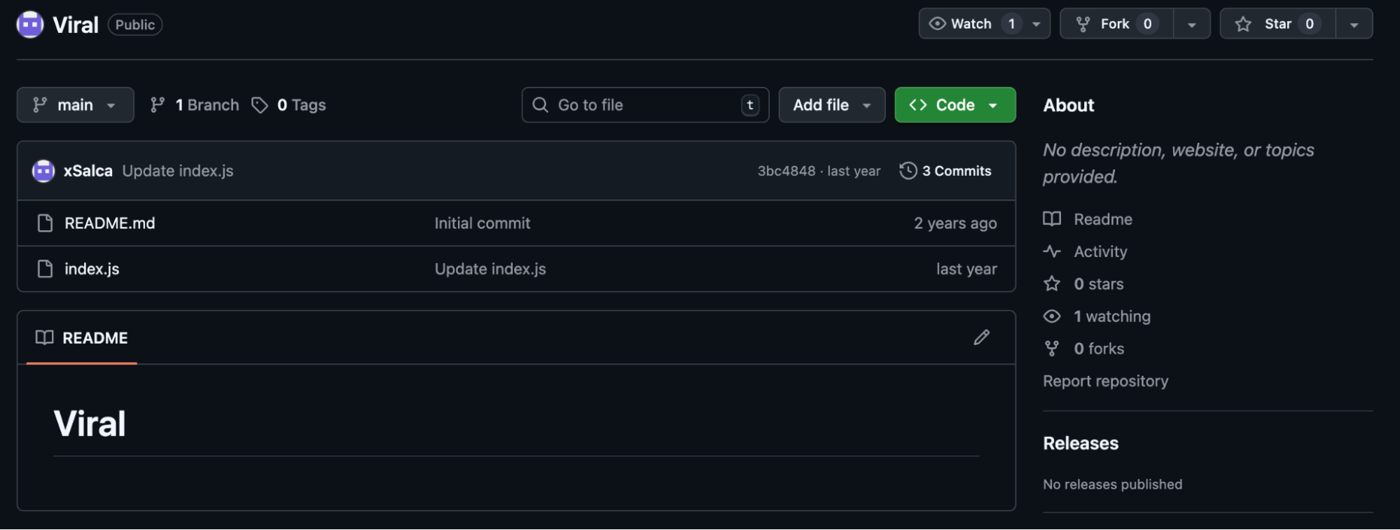In this payload as well, we see attempts of persistence, with the capability to self update based on github repo - https[:]//raw[.]githubusercontent[.]com/xSalca/Viral/main/index[.]js