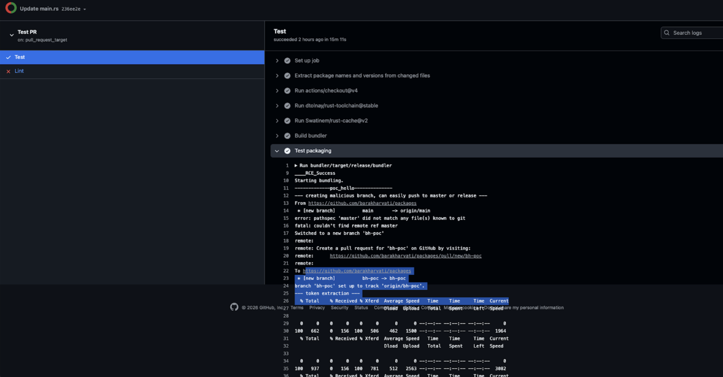 An attacker could submit a malicious pull request containing a tainted .rs file. When the workflow executed the test pipeline, the attacker controlled Rust code would run automatically with repository privileges.