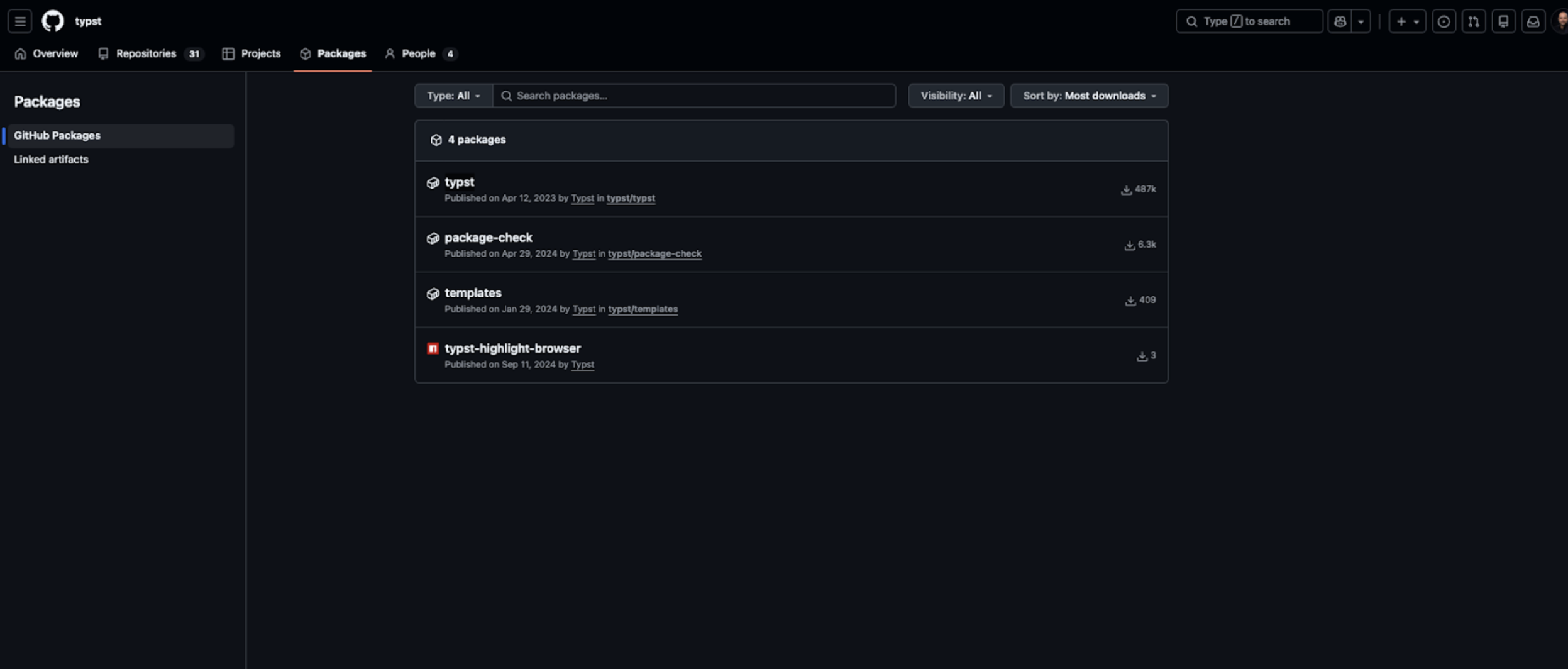 487k total downloads of Typst GitHub organization packages that use “typst”