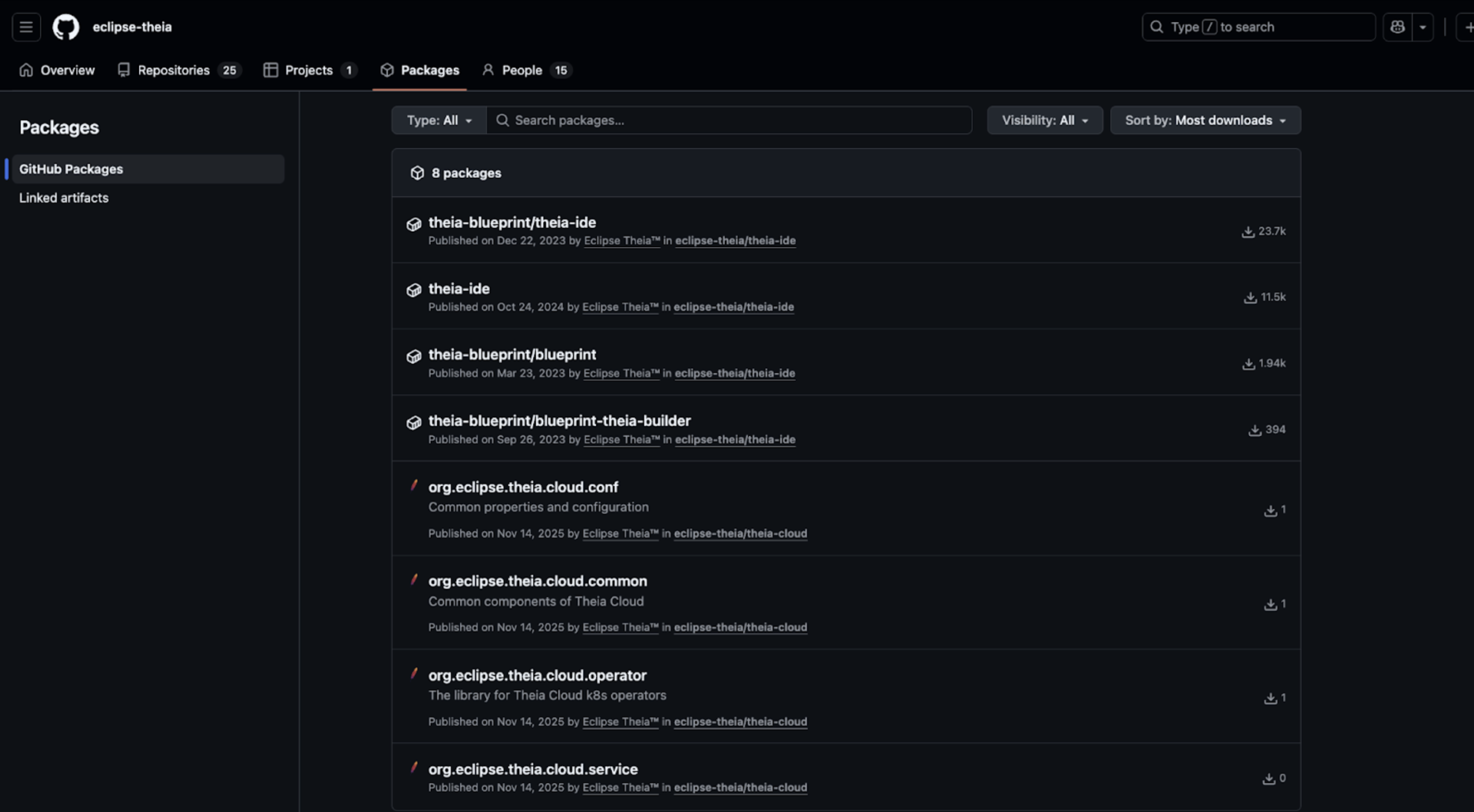 Packages in the org include theia-ide (~11.5k downloads), theia-blueprint (~1.94k downloads), and others (~37k total).