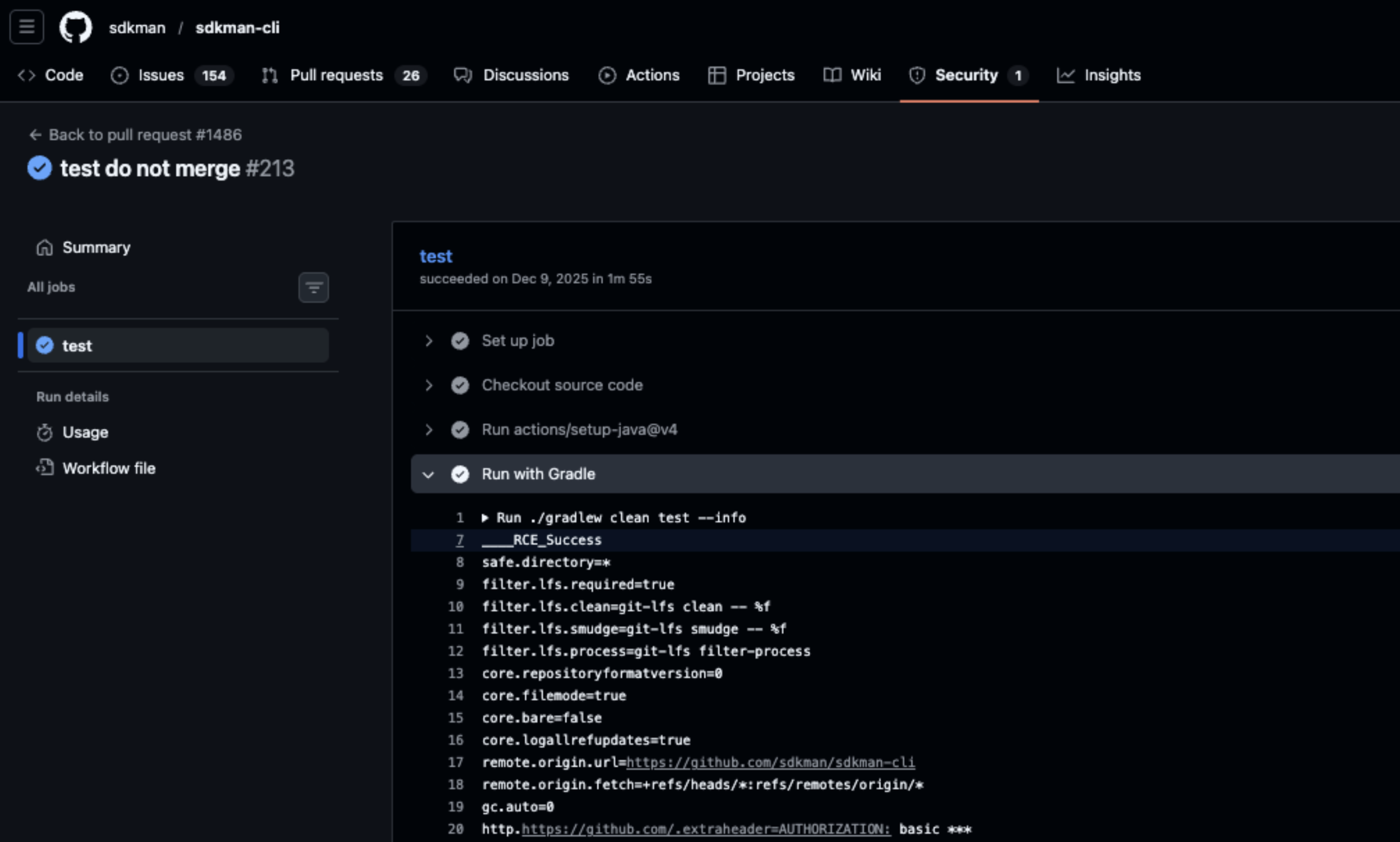 In this case, arbitrary command execution was successfully demonstrated within the CI environment.