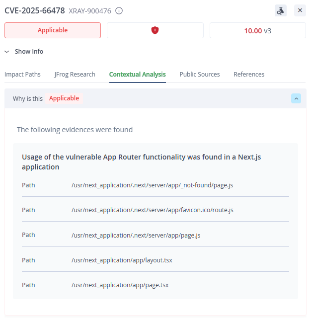 JFrog Advanced Security users can view Contextual analysis results for CVE-2025-55182 & CVE-2025-66478 -