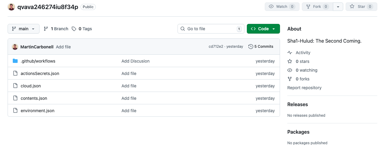 .jsonfiles from the GitHub repository created by the malware and decode their contents using the supplied script. Every file -actionsSecrets.json, contents.json,cloud.json,environment.json, etc. - must be decoded.