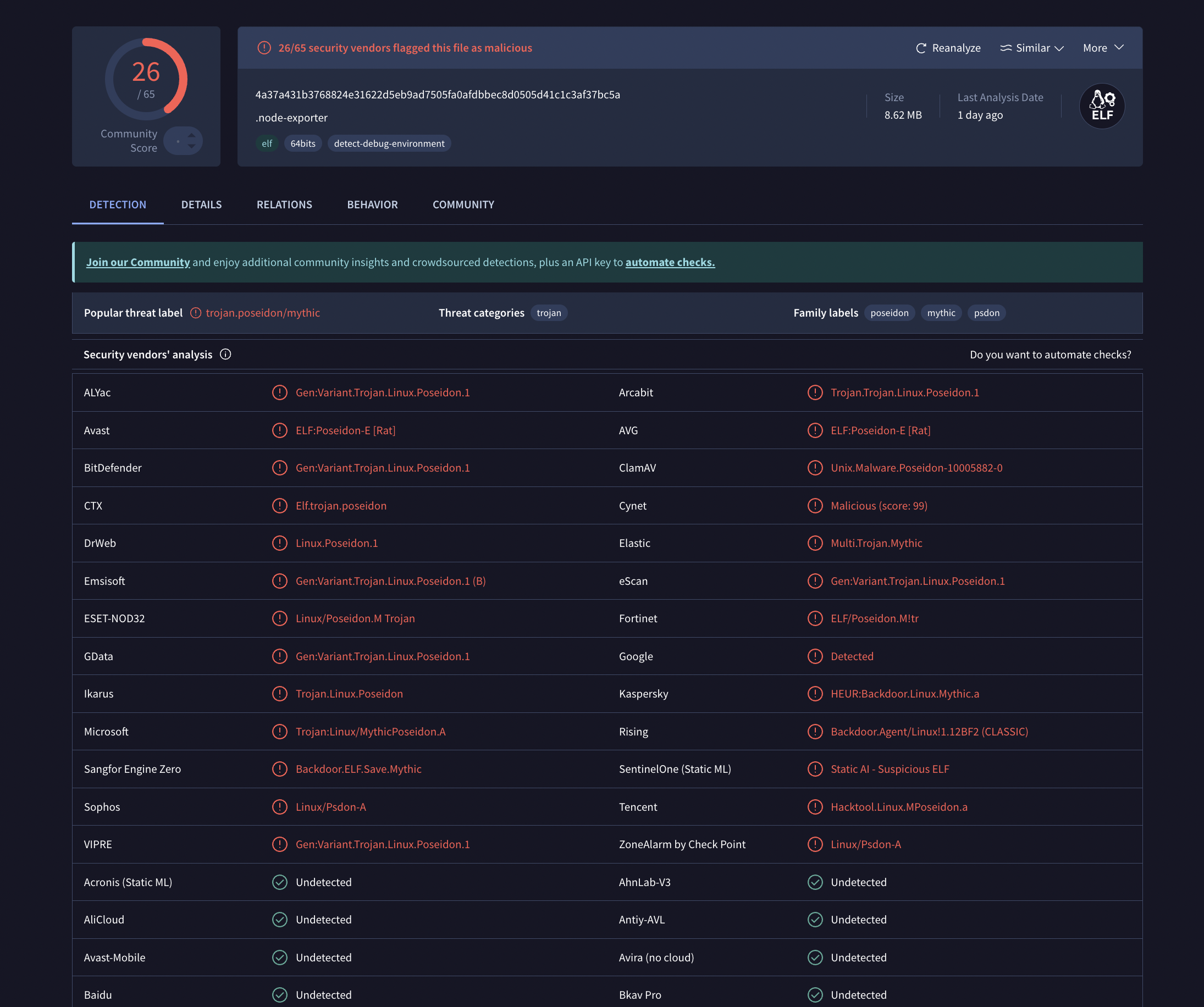 The binary node-exporter is a Poseidon agent for the Mythic C2 framework, a well-known open-source post-exploitation platform. It is classified as a trojan/backdoor (threat category: trojan family).